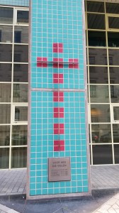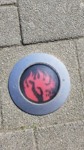 As we made our way back to our starting point, we found one of the markers delineating the line of fire that consumed the city after the bombing. These markers outline the entire path of the wall of fire and feature the image of the “Destroyed City,” a sculpture depicting the city in the form of a man with his heart missing to symbolize the loss of the heart of the city due to the bombings, outlined in front of flames.